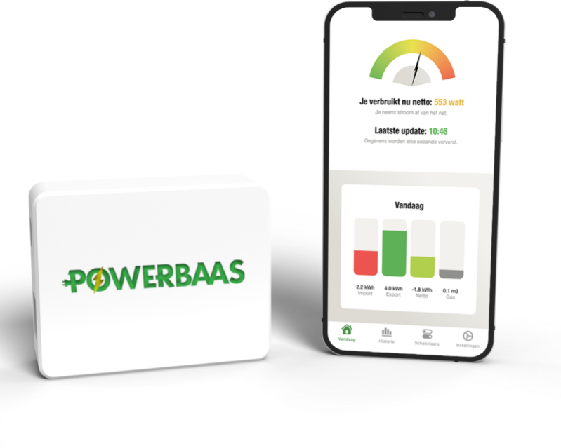 De Powerbaas App werkt samen met de Powerbaas Smart Meter P1 Module. Dit is een apparaatje dat je in de meterkast aansluit op de P1 poort van de slimme meter, waardoor de module live energieverbruik en meterstanden kan uitlezen. De module kan KlikAanKlikUit switches aansturen, zodat je via de app kan bepalen wanneer en bij hoeveel verbruik of opwek een apparaat aan of uit moet.