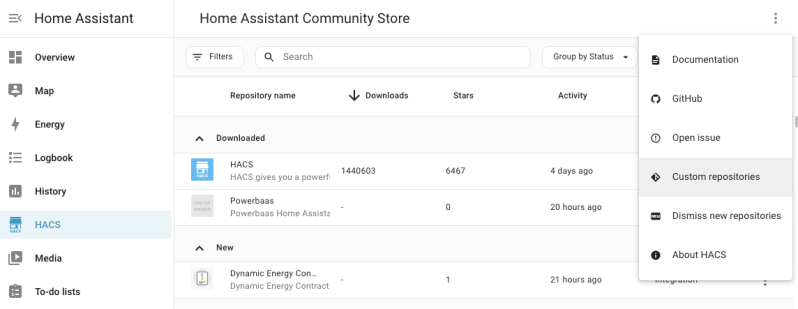Zorg ervoor dat HACS is geïnstalleerd, zie hiervoor uitleg op: https://www.hacs.xyz/docs/use/download/download/#to-download-hacs