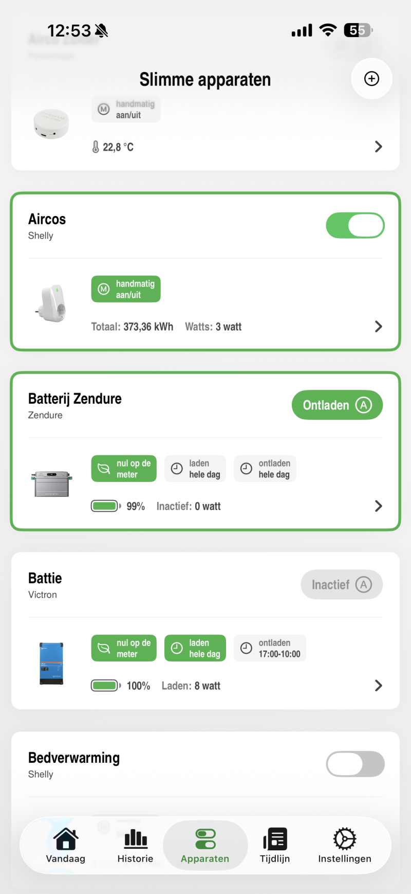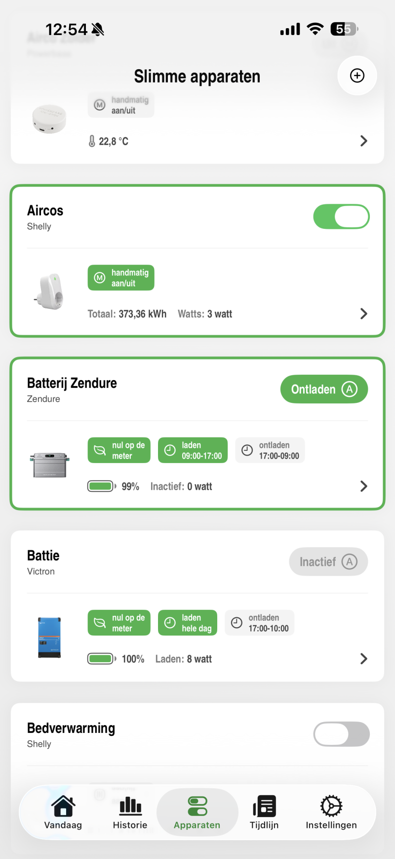 De batterij komt nu in de lijst met apparaten te staan. Standaard staat de 'nul-op-de-meter' actief aan. Hierbij wordt er geladen wanneer er veel zon opwek is, en ontladen als de zon onder is en het huis stroom begint af te nemen van het net.